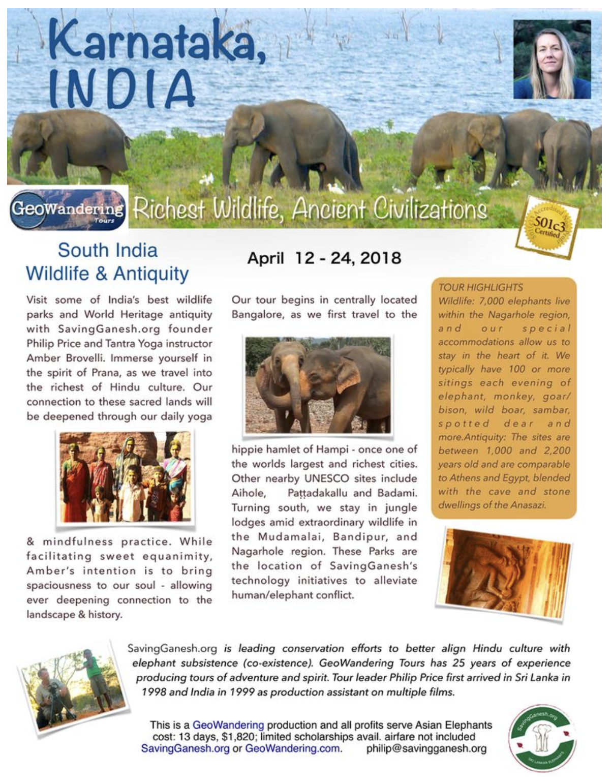 While SavingGanesh.org founder Philip Price will lead tours within the National Parks, Yoga instructor Amber Brovelli will co-lead our tour to the north. Amber will lead your immersion into the spirit of Prana, as we travel into the richest of Hindu culture. When time and place allows, we will connect evermore to these sacred lands through our yoga & mindfulness practice. While facilitating sweet equanimity, Amber's intention is to bring spaciousness to our soul - allowing ever deepening connection to the landscape & history.