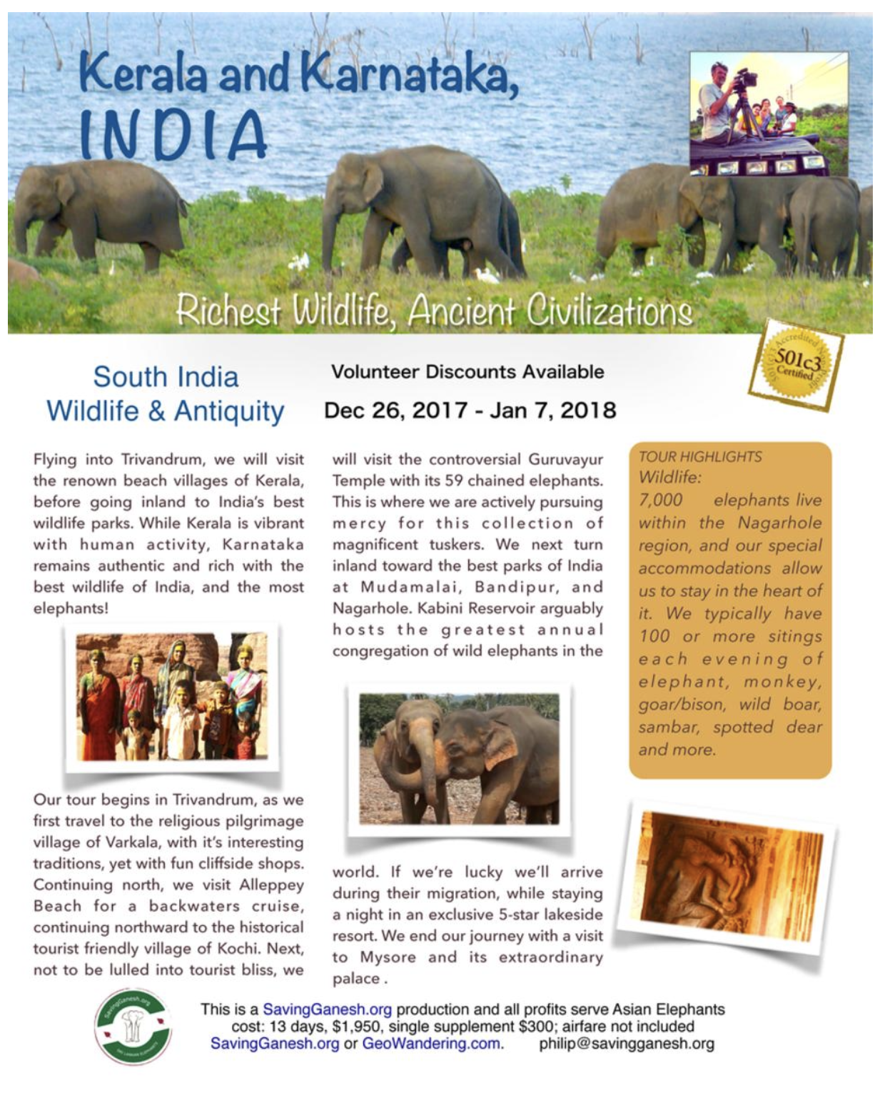 Mission: Kerala is full of captive elephants, while Karnataka has the world's largest concentrations of wild Asian elephants. SavingGanesh has ongoing projects in both regions and you can join in our goals of life enhancement for the captives, and preservation of habitats for the wild ones.