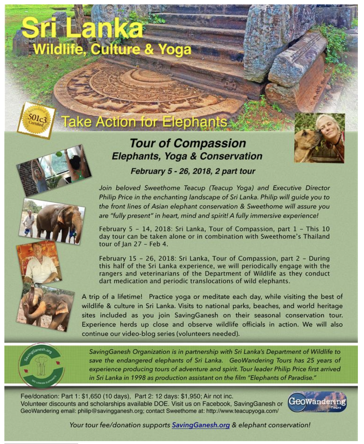 February 8 - 28, 2018; Two Part Tour: Sri Lanka, Tour of Compassion "Elephants, Yoga & Conservation" Join beloved Sweethome Teacup (Teacup Yoga) and Executive Director Philip Price in the enchanting landscape of Sri Lanka. Philip will guide you to the front lines of Asian elephant conservation & Sweethome will assure you are “fully present” in heart, mind and spirit! A fully immersive experience!