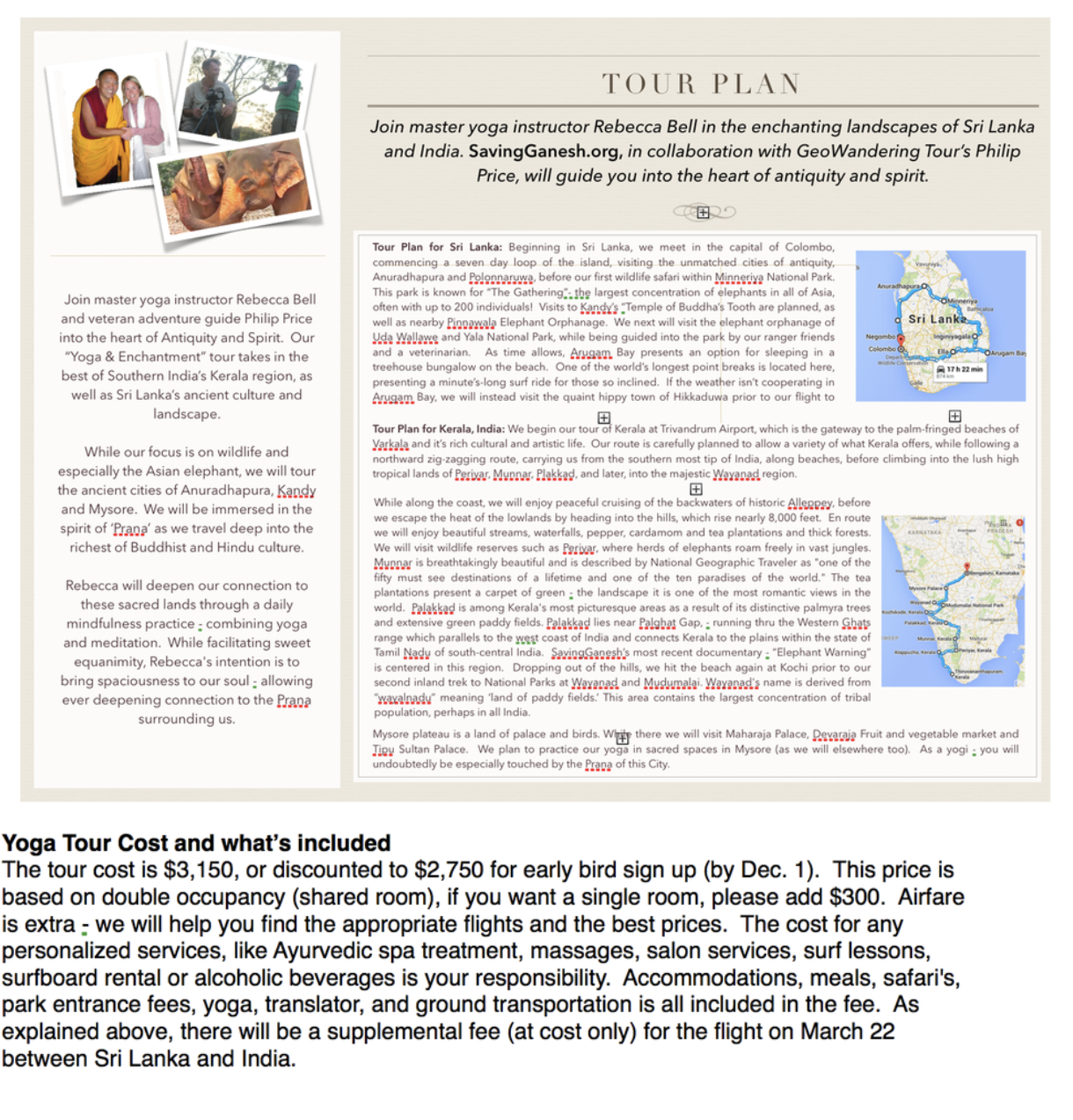 Tour Style: Our group will be on the move -- seeing the highlights of culture, landscape and wildlife. We are transported by comfortable air conditioned van, with professional driver. Translation and local lore will be provided by either our bi-lingual driver or a conservationist friend. When possible we will remain two nights in each western style accommodation, while exploring nearby sights. This is a family friendly tour, so we may adjust some itinerary plans based on consensus of parental and children's needs. Accommodations range from government guest houses in National Parks, to hotels and resorts. With the exception of malfunctioning equipment or local brown-outs, we will have hot water and air conditioning. However, the developing world is still "under-construction," so please be prepared for discomfort - which is part of our "mindfulness practice" after all ;)